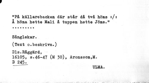 //// MPå källarebacken där står då två hörns :/: i höna hette Mali å tuppen hette Jöns." //// Sånglekar. (Text o.beskrivn.) //// 16105, s.'46-47 (M 50), Aronsson,!. //// D 245- //// * " ULM A. ////