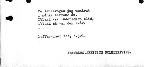 //// På landsvägen jag vandrat ^^^ i många herrans år» //// Ibland var väderleken blid, //// ibland så var den svår. //// « • //// Luffarvisor XXX, s.321. //// REHNBERG,ARBETETS FOLKDIKTNING. ////
