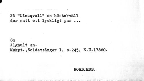 //// ...-... • •--..." .. — %. //// På "Limuqvell" en höstekväll der satt ett lyckligt par .•• //// Sm //// Ålghult sn. //// Mskpt*,Soldatsånger I, s.245* E.U.17860. //// NORD.MUS. //// * //// T //// : .v'i« - .j,- ... v <¦ , . aK t£i£' . äL$b>L :< km. .'.•¦ Ur^Ä . ...iwUhBh-.iiijÄ//:*1 ////