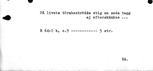 //// På livets törnbeströdda stig en enda tagg //// ej efterskänkes ••• //// B 64:2 b, s.9 —---5 str. //// HA. //// ¦ # ////