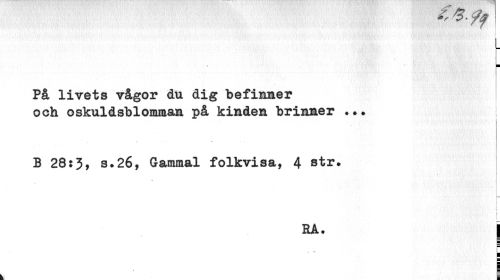//// *v I //// ¦ //// På livets vågor du dig befinner //// och o skuldsb1omman på kinden brinner ... j //// 3 //// B 28? 3, s.26, Gammal folkvisa, 4 str» //// - //// % i //// RA. j //// m //// r ////