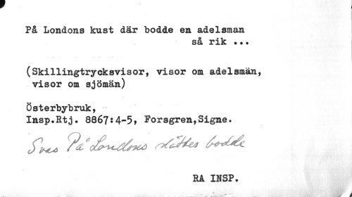 //// På Londons kust där bodde en adelsman //// så rik ... //// (Skillingtrycksvisor, visor om adelsmän, visor om sjömän) //// Österbybruk, //// Insp.Rtj. 8867:4-5» Forsgren,Signe. //// RA IHSP. //// * r. - AÉtfj' Å ////