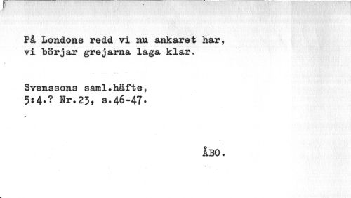 //// På Londons redd vi nu ankaret har, vi "börjar grejarna laga klar. //// Svenssons saral.häfte, //// 5s4.? Nr.23, s.46-47. //// ? //// ? //// ÅBO. ////