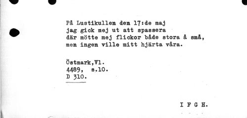 //// På Lustikullen den 17* de maj ^^ jag gick mej ut att spassera //// ^^ där mötte mej flickor både stora å små, //// men ingen ville mitt hjärta våra. //// Östmark,VI. 4489» s.10. D 310. //// I P G H. //// i ~ ' " ¦ ' ////