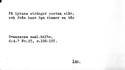 //// På lyrans strängar poeten slår, och från hans öga rinner en tår //// Svenssons saml.häfte, //// 6:4*T Hr»27, s.106-107- //// Ibo. ////
