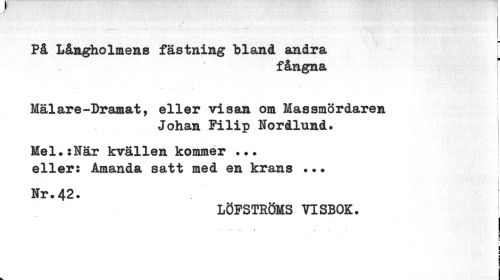 //// På Långholmens fästning bland andra //// t //// Mälare-Bramat, eller visan om Massmördaren //// J ohan //// Filip Nordlund. //// Mel.:När kvällen kommer ... i //// eller: Amanda satt med en krans ..• //// i //// Nr.42. //// LÖFSTRÖMS VISBOK. //// ¦ ' t ' - • //// i ¦ //// ¦ //// i //// ¦ //// ¦ ¦ //// i ////