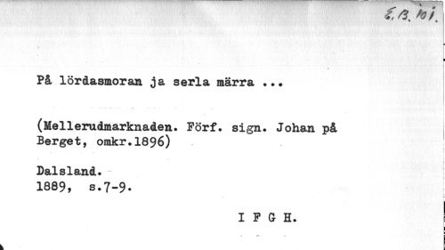 //// ¦ I //// « //// På lördasmoran ja serla märra . //// ... ... ... . ... • //// i i. //// (Mellerudmarknaden. Förf. sign. Johan på Berget, omkr.1896) //// Dalsland* 1889, s.7-9. //// ! //// I F G H. i //// i //// 1 //// f <b | //// E ////