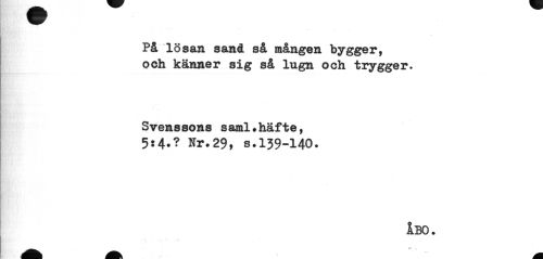 //// På lösan sand så mången bygger, och känner sig så lugn och trygger. //// Svenssons saml»häfte, 5:4.? Nr.29, s.139-140. //// åbo. ////
