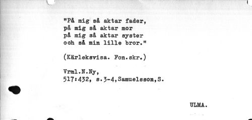 //// HPå mig så aktar fader, på mig så aktar mor på mig så aktar syster och så mim lille bror." //// (Kärleksvisa. Fon.skr») Vrml.N.Ny, //// 517*432, s.3-4»Samuelssoa,S. //// ULM A. //// . i //// s • - -. »*• ////