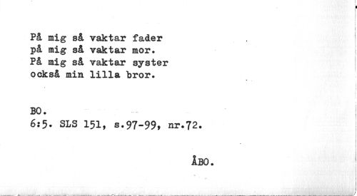 //// i //// i i i //// På mig så vaktar fader på mig så vaktar mor. På mig så vaktar syster //// också min lilla bror. //// • i //// i //// BO. | //// 6:5. SLS 151, s.97-99» nr.72. //// ÅBO. ////