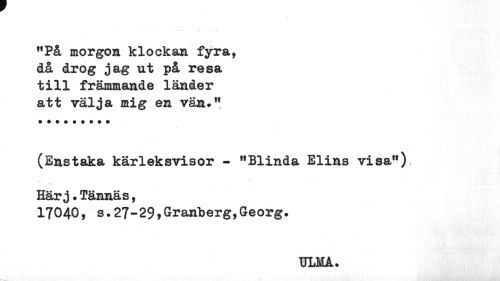 //// "På morgom klockan fyra, då drog jag nt på resa till främmande länder att välja mig en vän." //// (Enstaka kärleksvisor - "Blinda Elins visa") //// •r * //// Härj•Tännäs, //// 17040, s.27-29»Granberg,Georg. //// TJLMA. ////