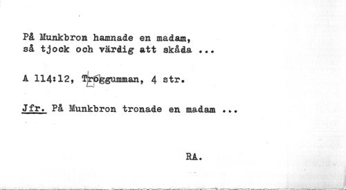 //// På Munkbron hamnade en madam, så tjock och värdig att skåda ... //// A 114512, T^öjggumman, 4 str» //// Jfr. På Munkbron tronade en madam .». //// / //// RÅ. ////