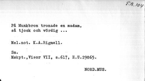 //// j i //// På Munkbron tronade en madam, så tjock och vördig //// Mel.not» K.Å.Rignell. //// / //// Sm. //// Mskpt.,7isor 711, s.617, E.B.29865. //// i //// — «r j //// NORD.MUS. //// 1 ////