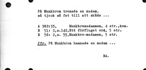 //// På Munkbron tronade en madam, så tjock så fet till att skåda ... //// Å 382:33, Munkbromadammen, 4 str»,kom» //// B 51: 2,s»142,Ett förfluget ord, 5 str» B 56: 2,s» 55,Mu^*>ro-madamen, 5 str» //// Jfr» På Munkbron hamnade en madam .»» //// wmmrnmmmmmmmi //// EA. ////