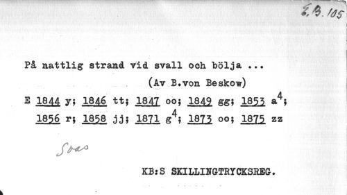 //// V. /<J$\ //// i I //// På nattlig strand vid svall och bölja ... //// (Av B.von Beskow) E 1844 y; 1846 tt; 1847 oo; 1849 gg; 1853 a4; i //// 1856 r; 1858 jj; 1871 g4; 1875 oo; 1875 zz //// KB:S SKILLIIGTRYCKSREG. //// < t - . -V A f ////