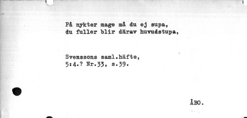 //// 0» //// På nykter mage må du ej supa, du fuller blir därav huvudstup a, //// Svenssons saml.häfte, 5«4.? Nr.33, s.39. //// ÅBO. //// TT , ////