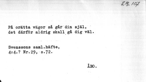 //// 'ty //// På orätta vägor så går din själ, det därför aldrig skall gå dig väl. //// Svenssons saml.häfte, //// 4:4.? Hr.29, s.72. //// ÅBO. //// v ////