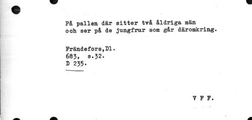 //// På pallen där sitter två åldriga män och ser på de jungfrur som går däromkring. //// Frändefors,Dl. //// 683, s.32. D 235- //// 7 F P. ////