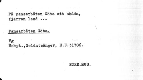 //// På pansarbåten Göta att skåda, fjärran land //// t //// i //// Pansarbåten Göta. Vg //// Mskpt.»Soldatsånger, E.U.31706. //// NORD.MUS. //// * //// L ////