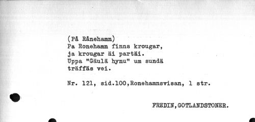 //// t .'1 wj^jjj //// (På Rånehamn) //// Pa Ronehamn finns krougar, ja krougar äi partäi. Uppa tfGräuIä hynu1' um sunda träffas vei. //// Hr. 121, sid.lOO,Ronehamnsvisan, 1 str. ^ FREDIS,GOTLANDSTONER. ////