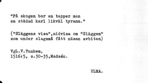 //// "På skogen bor en tapper man en städad karl likväl tyrann." //// ¦n //// ("Släggens visa",nidvisa om "Slaggen" som under slagsmå fått näsan avbiten) //// VgL. V.Tunhem, //// 1516:5, s.50-55,Madsen. //// ULMA. ////