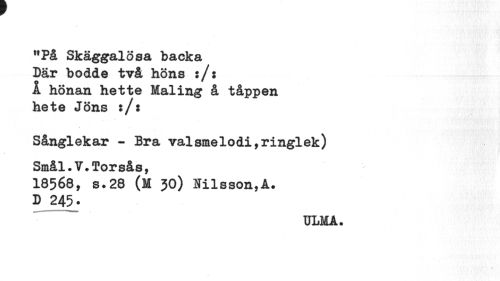 //// 11 På Skäggalösa backa Där bodde två höns :/: l hönan hette Maling å tåppen hete Jöns :/: //// Sånglekar - Bra valsmelodi,ringlek) Smål.V.Tor sås, //// 18568, s.28 (M 30) Nilsson,A. //// » 245. //// ULM A. ////