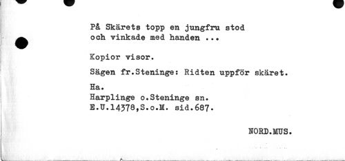//// På Skärets topp en jungfru stod ^^ och vinkade med handen . //// Kopior visor. //// Sägen fr.Steninge: Ridten uppför skäret. Ha. //// Harplinge o.Steninge sn. E.U.14378,S.o.H. sid.687* //// HORD.MUS. //// • " i. •., * - :.• i . . //// f* //// ^ ___ .,___ __ ___ —___ „___¦ ___„___^Jtv.___-v- v--*--- ////