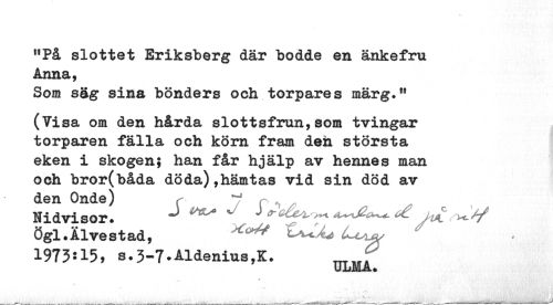 //// "På slottet Eriksberg där bodde en änkefru Anna, //// Som säg sina bönders och torpares märg." //// (Visa om den hårda slottsfrun,som tvingar torparen fälla och körn fram den största eken i skogen; han får hjälp av hennes man och bror(båda döda),hämtas vid sin död av den Onde) , T1 i ^ //// Nidvisor. J ^ ^ J^m-uiÄ^^Juls^*/ //// Ögl.Älvestad, tsUÄ* L+y, //// 1973115, s.3-7.Aldenius,K. __ . //// ULMA. //// t. //// ^ _ ___ ___ ___ .., ... ¦ — ¦ _,__~—---—___-___mm* ---1—---ay^ ////