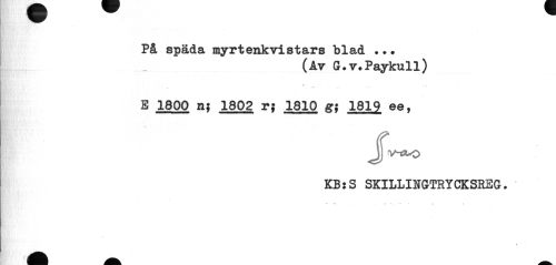 //// På späda myrtenkvistars blad //// (Av G.v.Paykull) //// » ... //// E 1800 n; 1802 rj 1810 g; 1819 ee, //// r ' (L^ //// JJ V~Ä«O //// KB:S SKILLIEGTRYCKSREG. //// '4 .::•.¦•••» - S //// » //// M m — ////