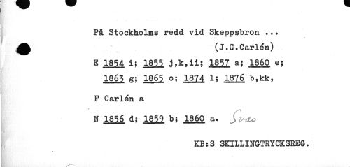 //// På Stockholms redd vid Skeppsbron ... ^k (J.G.Carlén) //// E 1854 i; 1855 j,k,ii; 1857 a; 1860 ej 1865 Si 1865. o; 1874 1; 18l£ b,kk, //// P Carlén a //// N 1856 d? 1859 b; 1860 a. yi^Lo //// KB:S SKILLINGTRYCKSREG. //// v" ////