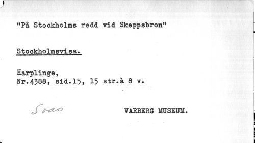 //// r,På Stockholms redd vid Skeppsbron" //// ¦ //// S tockholmsvi sa» ! //// Harplinge, //// Nr.4388, sid.15, 15 str.å 8 v. //// i //// ! s //// jft-iZsO VARBEBG MUSEUM. j //// i //// s //// i //// l //// m //// t= I ////