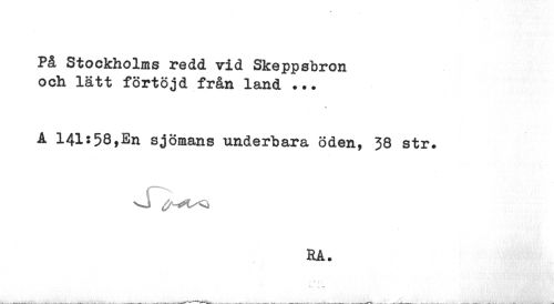 //// På Stockholms redd vid Skeppsbron och lätt förtöjd från land ... //// A 141:58,En sjömans underbara öden, 38 str. //// vj //// RA. ////