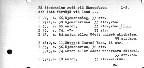 //// På Stockholms redd vid Skeppsbron 1-2. //// och lätt förtöjd vid land ... //// B 22, s. 66,Sjömanssång, 33 str. B 27:1,s. 30,Sjömansvisan, 33 str.,kom# B 35, s. 33,Anton, 33 str.,kom. ^^ //// B 40, s. 74, 33 str. //// B 45, s. 64,Anton eller ödets underb.skickelse, //// 33 str.kom. //// B 46:2,s. 11,Skeppet Gustaf Vasa, 18 str. B 53» s. 56,Sjömansvisa, 32 str. ^fc B 59:5>s. 74>&iaton eller ödets underbara skickel. //// 33 str.kom. B 59:7?s. 18,Anton, 33 str.mel.kom. //// HA. ////