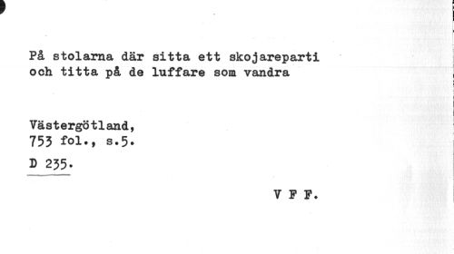//// I //// På stolama där sitta ett skojareparti och titta på de luffare som vandra //// i //// j. //// Västergötland, 753 fol., s.5. //// D 235- //// 1 //// V F F. ////