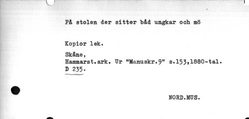 //// / //// På stolen der sitter båd ungkar och mö //// Kopior lek* Skåne, //// Hammarst.ark. Ur "Manaskr.9M s.l53»1880-tal. D 235- //// ^ NOHD.MUS. ////