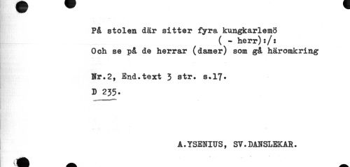 //// På stolen där sitter fyra kungkarlemö //// ( - herr):/: Och se på de herrar (damer) som gå häromkring //// Nr.2, End.text 3 str. s*17» //// D £35- //// A.YSENIUS, SV.DANSLEKAR. ////