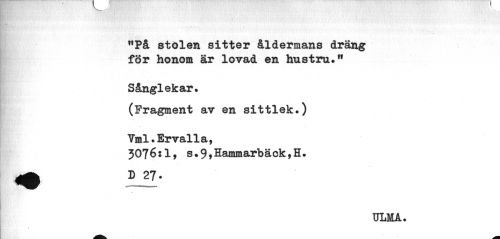 //// "P& stolen sitter åldermans dräng för honom är lovad en hustru." //// Sånglekar. //// (Fragment av en sittlek.) Tml.Ervalla, //// 3076:1, s.9»Hammarbäck,E. //// ULM A. ////
