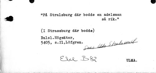 //// ^ wPå Stralsburg där bodde en adelsman //// så rik." //// (i Strassburg där bodde) //// Dalsl. Högsäter, 5405, s.21,Löfgren. //// ^ViC TJLMA. ////