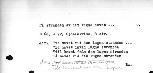 //// ¦ //// På stranden av det lugna havet . .. 2. //// . ... //// ¦ //// B 60, s*92, Sjömansvisa, 8 str. //// Jfr. Vid havet vid den lugna stranden .. • //// MMfeMMMnaaMM __^ //// Vid havet invid lugna stranden Till havet från den lugna stranden ^^ På havet vid den lugna stranden //// S ^Uo (Z^d&c^, ZZr^zz&L ^ //// Tji/ Aevvvut/ u^ywk. ////