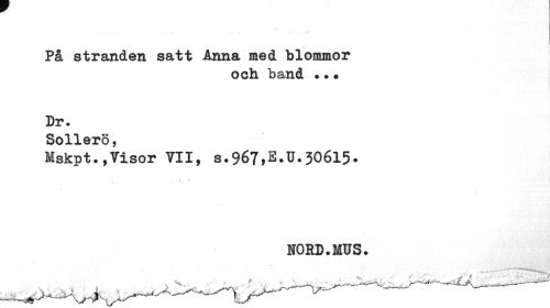 //// På stranden satt Anna med blommor //// och band . •• //// Dr. //// Sollero, //// Mskpt.,Visor VII, s.967,E.U.306l5. //// 2 L //// NORD.MUS. ////