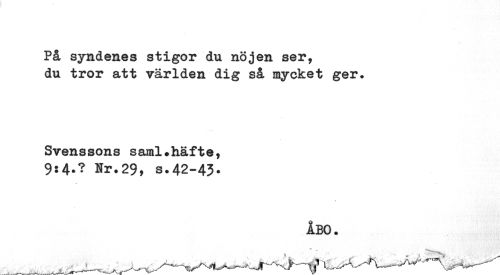 //// På syndenes stigor du nöjen ser, du tror att världen dig så mycket ger. //// Svenssons saml.häfte, //// 9:4.? Kr.29, s.42-43» //// 0 //// / //// ÅBO. //// ___,_ ////