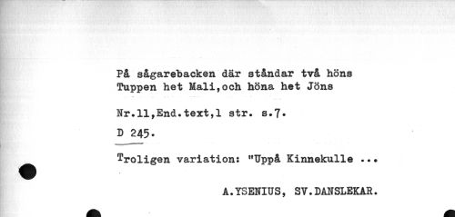 //// m i , • //// På sågarebacken där ståndar trå hons Tuppen het //// MåXii • //// och höna het Jöns //// Nr.ll,End. text,l str. s.7» D 245. //// ^^ Troligen variation: "Uppå Kinnekulle ... //// A.YSENIUS, SV.DANSLEKAR. ////