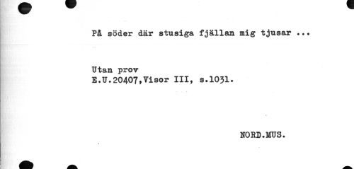//// På söder där stusiga fjällan mig tjusar Utan prov //// E.U.20407,Visor III, s.1031. //// % //// NORD.MUS. //// A ////