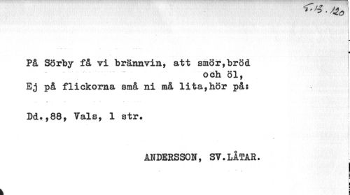 //// -Ko //// m //// ¦'••.''' '' I //// k i //// På Sörby få vi brännvin, att smör,bröd //// och öl, //// Ej på flickorna små ni må lita,hör på: //// O '•¦ ... //// Bd.,88, Vals, 1 str» ! //// i //// ANDERSSON, SV.LÅTAR. //// I //// c t //// k i ////