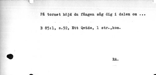 //// På tornet höjd du fången såg dig i dalen om //// \ //// >. * ... //// B 85sl, s.92, Ett Qväde, 1 str.,kom. //// ^ EÅ. ////