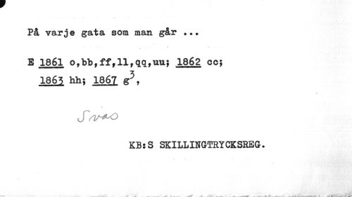 //// På varje gata som man går //// ¦ • v //// E 1861 o,bb,ff,ll,qq,uu; 1862 cc; //// 1865 hh; 1867 g5, //// Sn^o //// KBsS SKILLINGTRYCKSREG. ////
