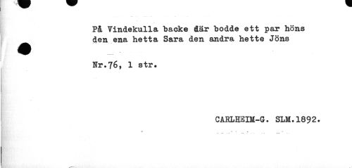 //// På Vindekulla backe åar bodde ett par höns den ena hetta Sara den andra hette Jöns //// Nr.76, 1 str. //// CAHLHBIH-O. SLM.1892. //// -T ////