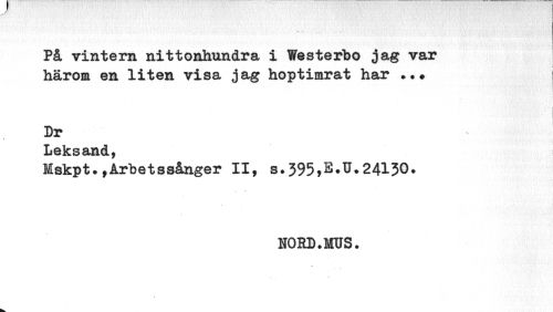 //// På vintern nittonhundra i Westerbo jag var härom en liten visa jag hoptimrat har //// ¦ "-.i i //// Dr //// Leksand, //// Mskpt.,Arbetssånger II, s.395,E.U.24130. //// NORD.MUS. ////