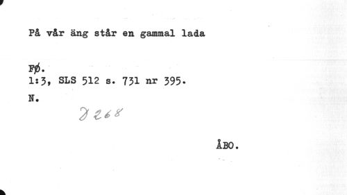 //// t //// Få vår äng står en gammal lada F0. //// 1:3, SLS 512 s. 731 nr 395. //// N. //// ÅBO. //// * t //// k ////