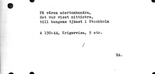 //// På våren adertonhundra, //// det var visst nittiotre, //// till kungens tjänst i Stockholm //// A 190:44, Krigarvisa, 9 str. //// / //// RA. //// « ////
